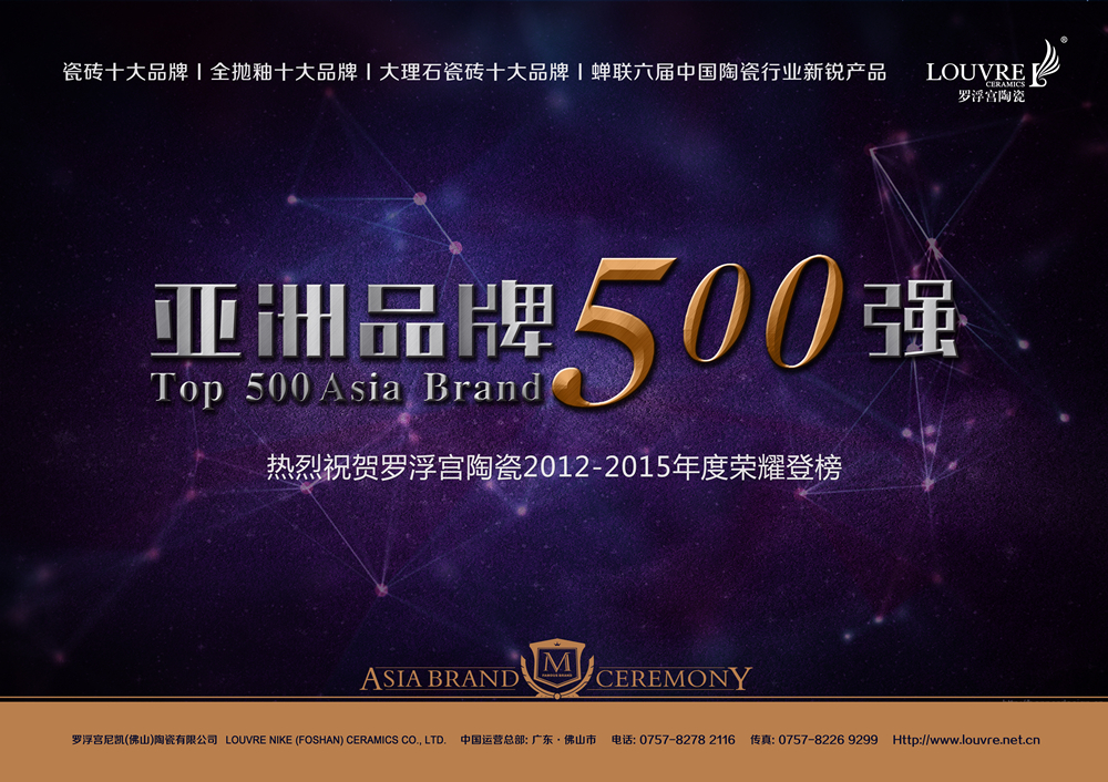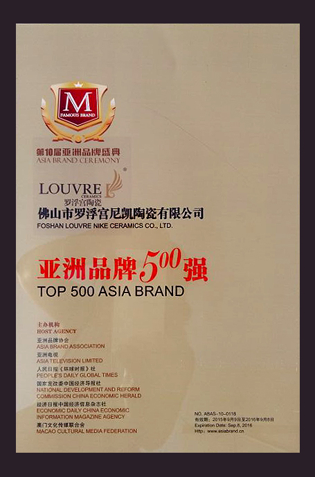 2015年9月9日,以“品牌決勝未來(lái)”為宗旨的第十屆“亞洲品牌500強(qiáng)”頒獎(jiǎng)典禮在澳門隆重舉行,來(lái)自亞洲各國(guó)政要、商業(yè)巨擘及各行業(yè)精英領(lǐng)袖嘉賓出席會(huì)場(chǎng)。三星、海爾、五糧液等亞洲領(lǐng)導(dǎo)品牌紛紛入選。作為國(guó)際高端瓷磚品牌代表,羅浮宮陶瓷以高端領(lǐng)先的行業(yè)地位和持續(xù)創(chuàng)新的工藝技術(shù),實(shí)現(xiàn)四年蟬聯(lián)“亞洲品牌500強(qiáng)”榜單,再次彰顯其品牌地位和影響力。